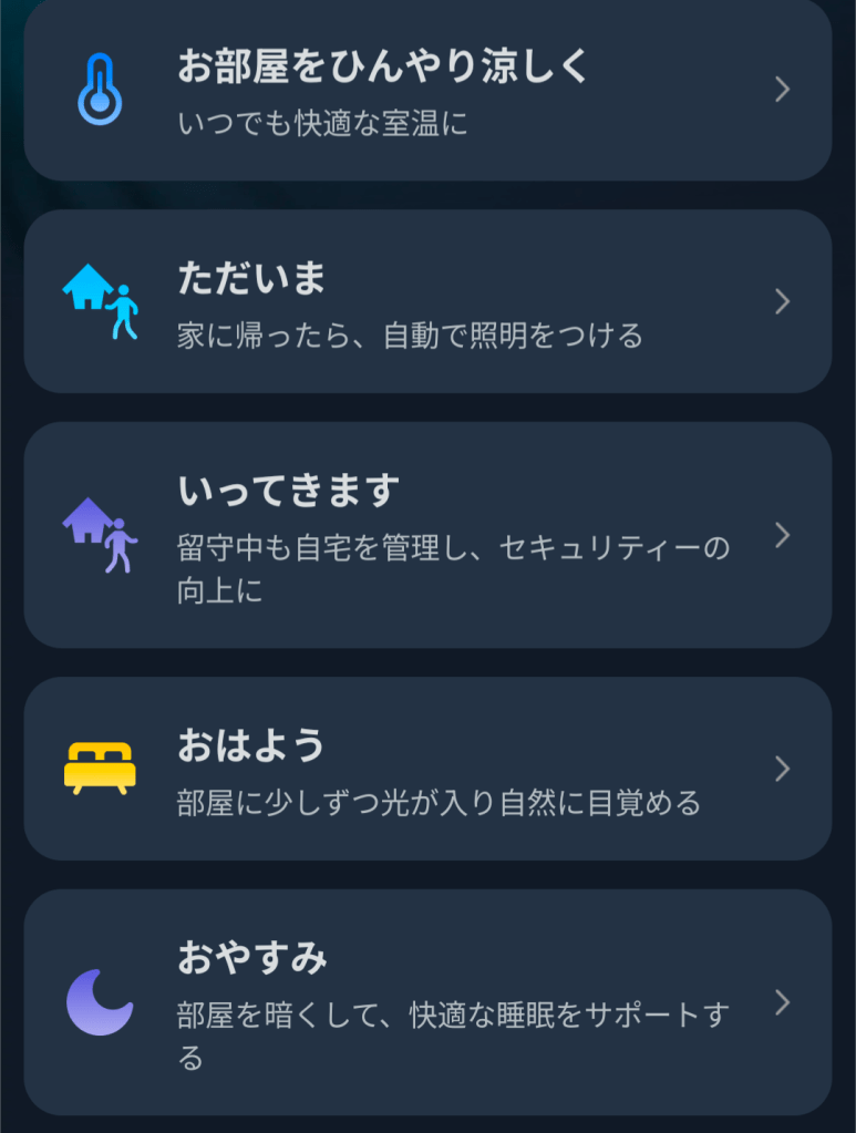 - シーン設定による一括操作: 「おはよう」「おやすみ」「いってきます」などのシーンに合わせて、複数の家電を一度に操作できます。「おやすみ」シーンで、部屋の照明を全て消し、テレビとエアコンをOFFにする、といった設定が便利です。